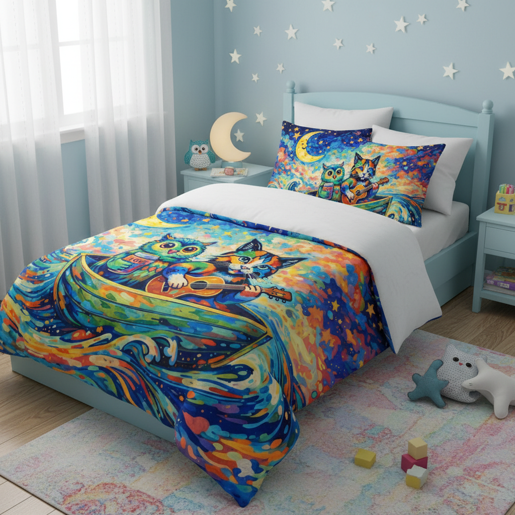 Whimsical Cat & Owl Rowboat Comforter — Colorful Starry Night Kids Bedding